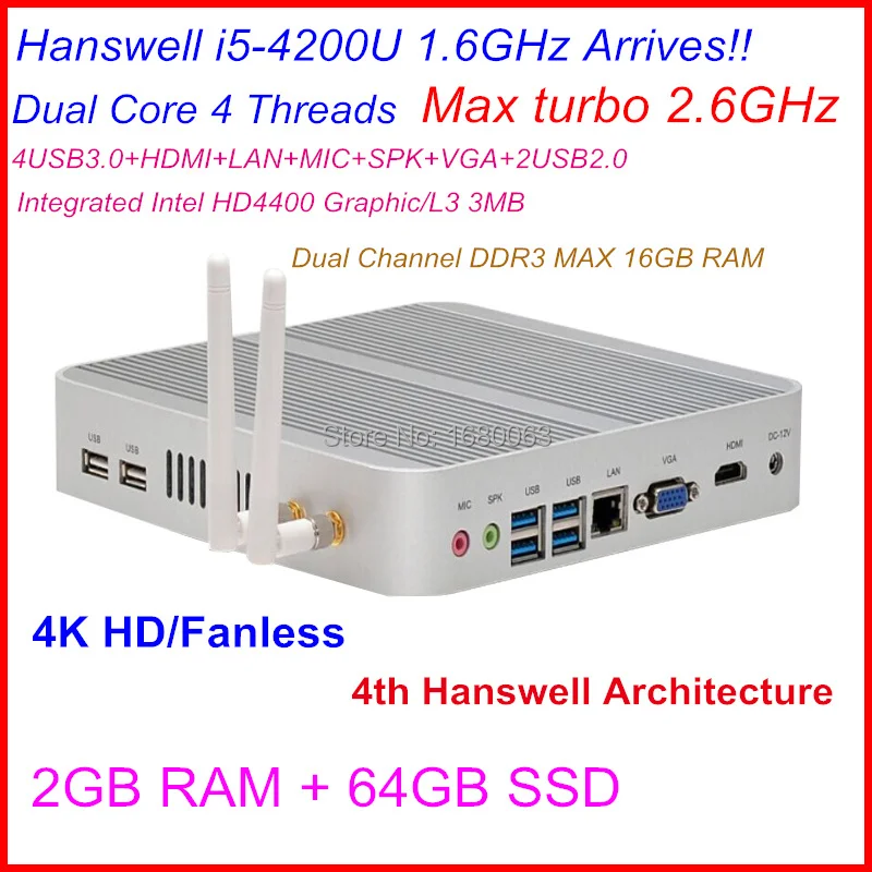 Main Features : 4K HD mini pc i5 with Intel Core i5 4200U 1.6Ghz CPU Haswell Architecture SOC design 2G RAM 64G SSD windows7/8 Linux